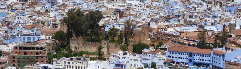 A driver met us at the port in Tangier.  We rode for two hours along narrow well-paved roads, past fields and farms, animals and rebar to the edge of the medina in the center of Chefchaouen {“Look to the Horns” in English, due to two hornish-shaped mountains that nestle against the outskirts of town}.  We wandered through squiggly alleys until we found our habitation, Riad Rifandalus, where pictures of the Alhambra adorned the walls.