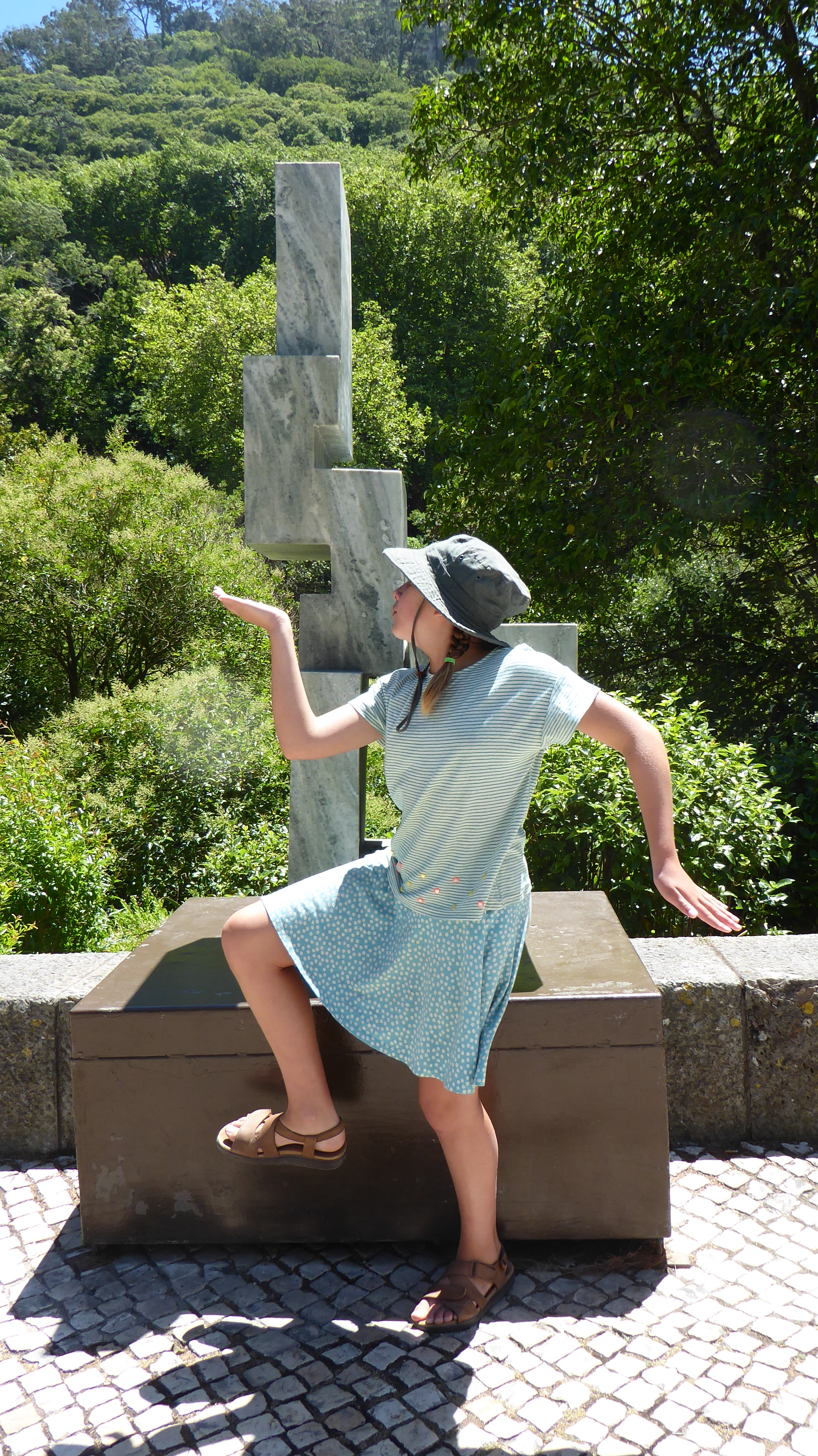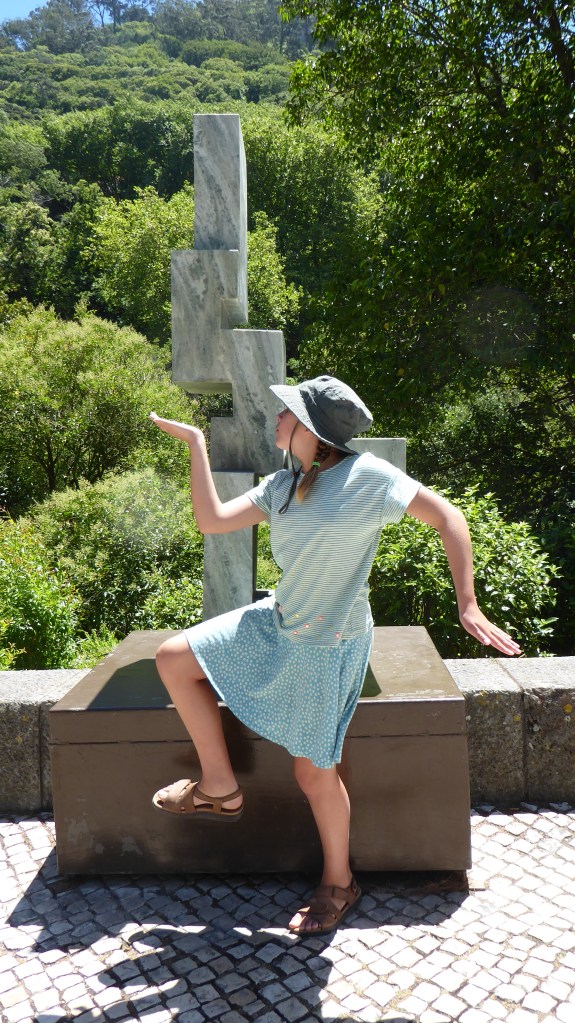 Girl with abstract sculpture.